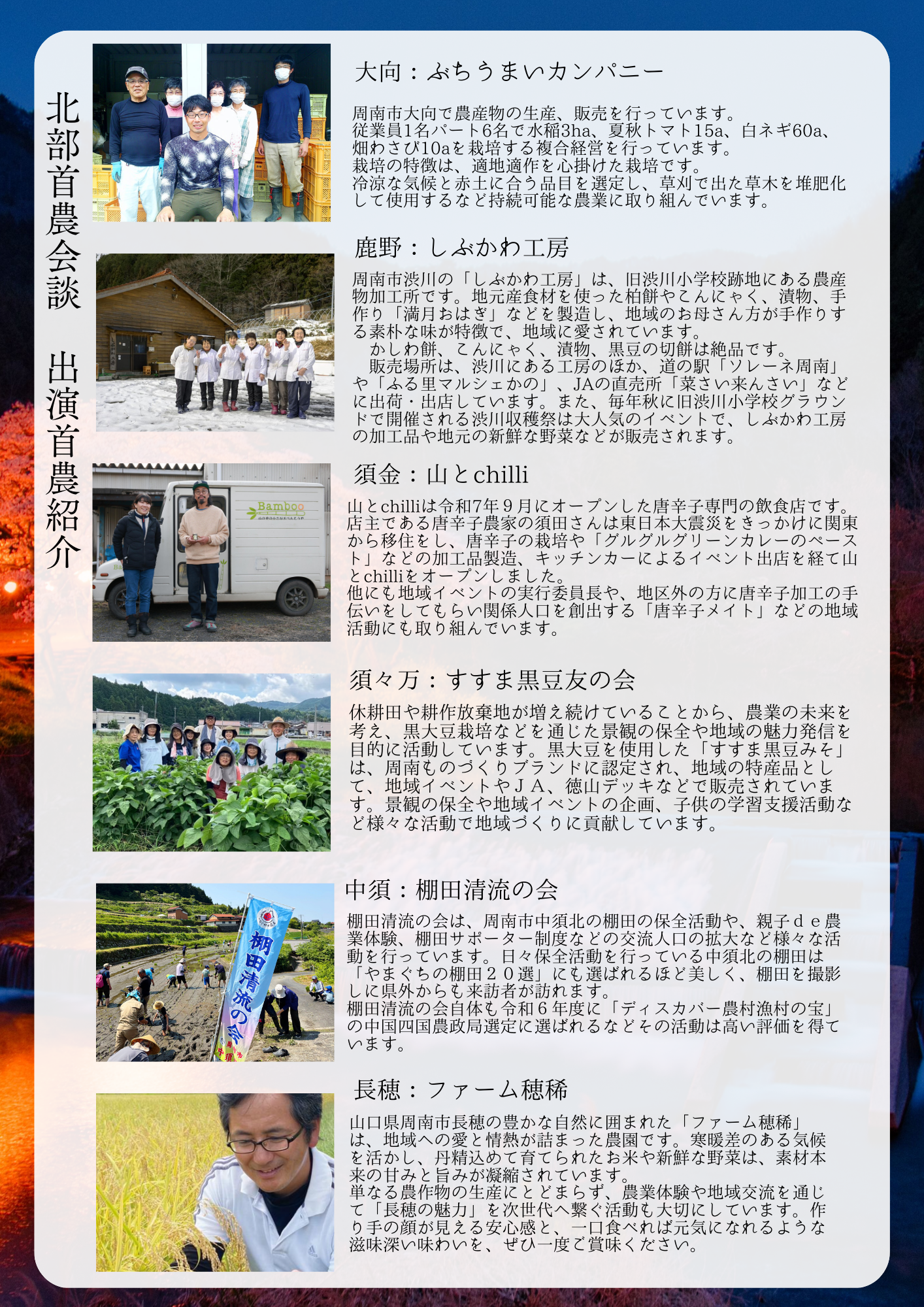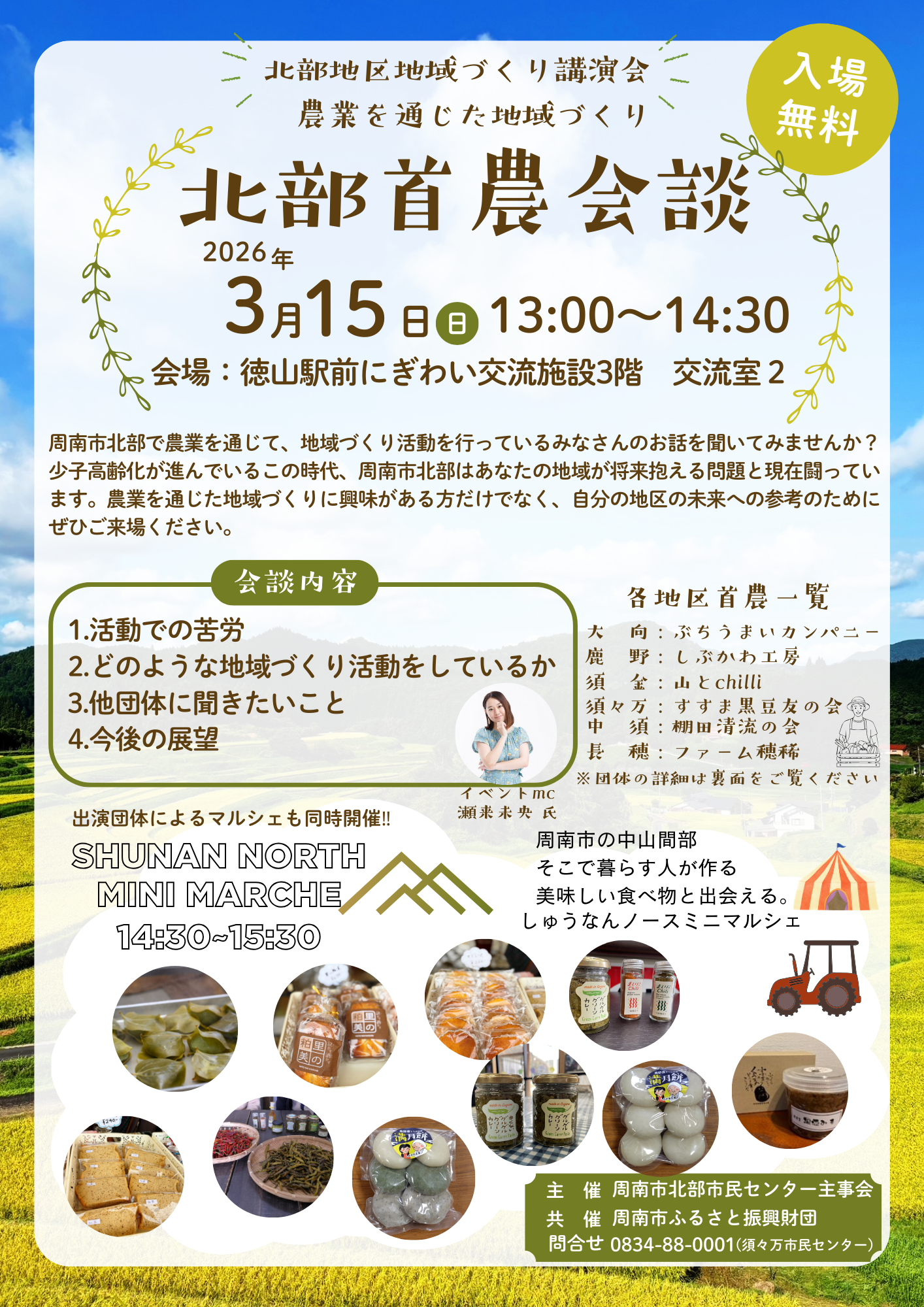 徳山駅前にぎわい交流施設にて3月15日(日)13:00~14:30 農業を通じた地域づくり活動を行っている6地区の代表者の方のお話を聞いてみませんか?会場内ではミニマルシェも開催し農産品も楽しめます。同日は「しゅうなん市民活動フェスタ2026」も開催されており、餅まき、菓子まきなど盛りだくさんです。是非、ご来場ください。